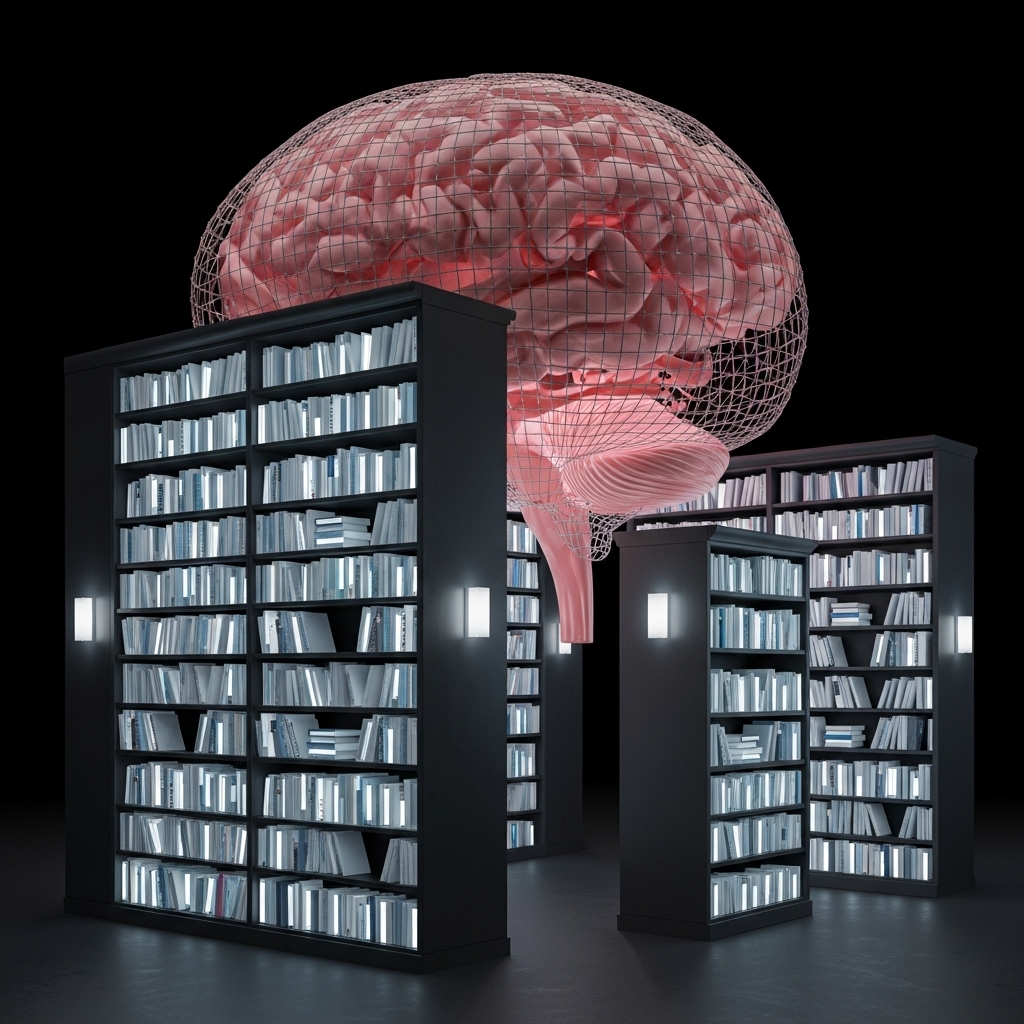 Now imagine walking through a grand library – rows of glowing bookshelves filled with everything you’ve ever learned. Some books are bright (recent lessons), while others are dusty and fading (forgotten ones).